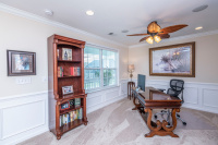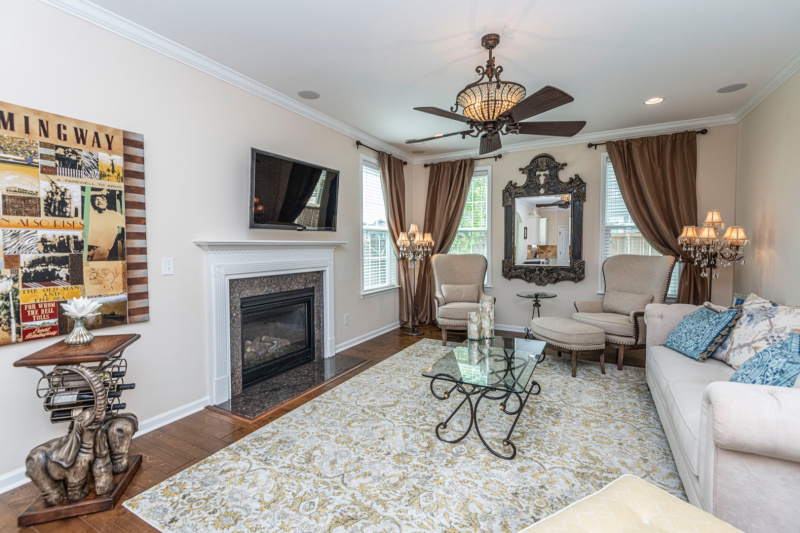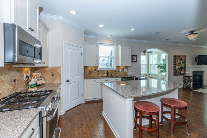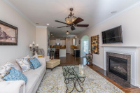 This beautifully designed floorplan offers an abundance of natural light with lakefront views. Numerous upgrades include heavy crown moldings, rich walnut wood flooring, Wainscoting in the dining room and shiplap accent walls in foyer. This open floor plan offers a Butler Pantry with a Gourmet kitchen adorned with under cabinet lighting, Stainless appliances including a Cafe Dual-Fuel Convection Range with baking drawer, Palermo Quartx Counter tops, Tumble Stone Tile Backsplash, and a spacious island. With crown molding, and numerous recessed lights and ceiling fans this home is a delight. Enjoy these beautiful days in the back sunroom overlooking the lake and picturesque landscaped fenced yard with irrigation system. Surround Sound speakers in Kitchen, Living room, Loft and Master Suite. Windows have faux wood blinds. Enjoy those cool evenings in front of the traditionalgas fireplace in the family room. Upstairs, the master suite has a huge walk in closet, custom cabinetry, crown molding, tray ceiling, and a separate sitting area. Relax after a long day in the jetted tub or walk-in shower. The granite countertops with two sinks enhance this already stunning home. Maticuliously maintained you can see why this home is a gem. Blooming flowers in the front landscape will welcome you home.