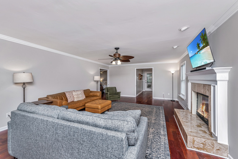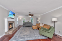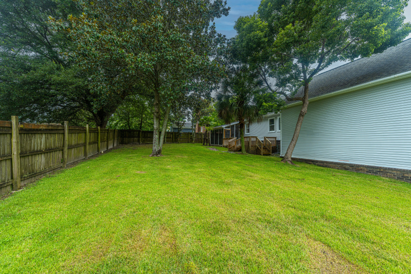 This is a beautiful traditional two-story home with a welcoming full front porch, a separate dining room, spacious family room with fireplace and a nice playroom just off the family room with access to a back screen porch. A 10 X 17 back deck overlooks a large privacy fenced in backyard adorned with numerous palm trees. The master bedroom is downstairs enjoys a nice walk-in closet, a newly renovated master bath with a walk-in shower, double sinks, tile floor and granite counter tops. Bold crown molding adorns the first floor with smooth ceilings. The open kitchen offers easy access to the dining room and includes a breakfast area, white cabinetry, granite countertops, electric smooth top range, Blt in Microwave, a pantry and a spacious kitchen island. There are numerous windows in this home that invite an abundance of natural light. The upstairs includes 2 very nice bedroom and a full bath with tile floors. As a bonus there is an incredible FROG ( Finished Room Over Garage) with separate heating and cooling. The two car garage also offers a small work space. To the left of the home you'll find a double gate for parking that camper or boat next to home. HVAC Downstairs replaced in winter 2020 and Upstairs in Spring 2019.